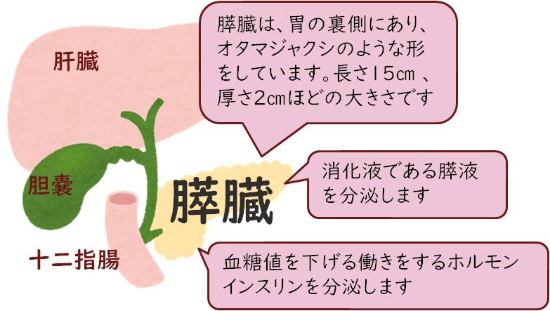 糖尿病は、血液中の血糖値(血の中のブドウ糖の量)が慢性的に高くなる病気です。 食事をすると血糖値が上がりますが、 通常は膵臓から分泌されるインスリンというホルモンが働いて血糖値を下げます。